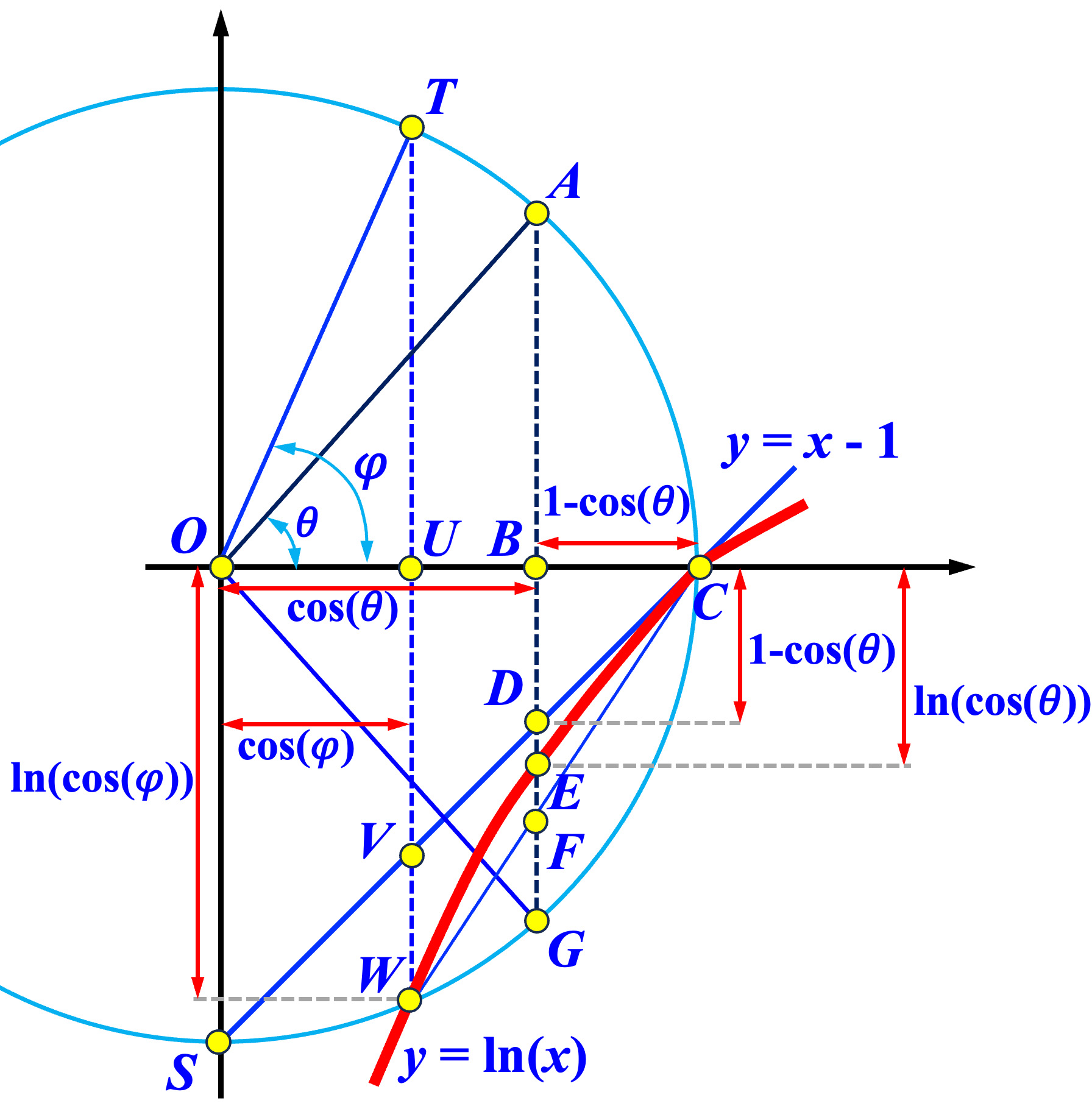 Let \( \varphi = \angle TOU \). Let \( A \) be a point on the unit circle. If \( \theta = \angle AOC > \varphi \), the line through \( A \) and perpendicular to \( \overleftrightarrow{OC} \) does not interset the curve of \( \ln() \) in \( \bigtriangleup CVW \). Hence, we are safe to assume that \( \theta \leq \varphi \). Let the line through \( A \) and perpendicular to \( \overleftrightarrow{OC} \) meeting \( \overleftrightarrow{OC} \), \( \overleftrightarrow{SC} \), the curve of \( \ln() \), \( \overleftrightarrow{WC} \) and the unit circle (again) at \( B \), \( D \), \( E \), \( F \) and \( G \). In this way, we have the following: $$ \begin{eqnarray*} \overline{OB} &=& \cos(\theta) \\ \overline{BC} &=& \overline{BD} = 1-\cos(\theta) \\ \overline{BE} &=& |\ln(\overline{OB})| = |\ln(\cos(\theta))| \end{eqnarray*} $$