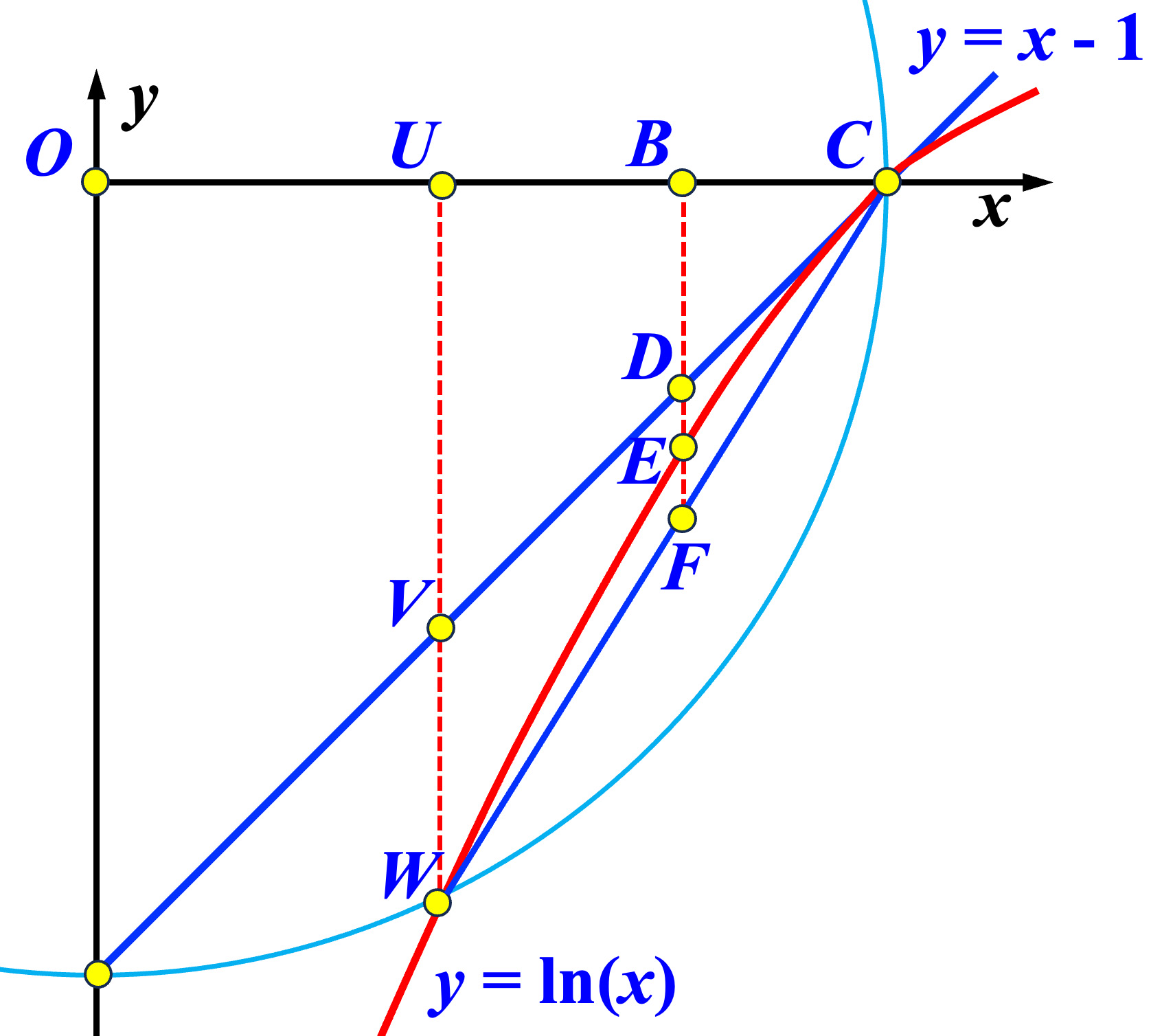 Now, consider the unit circle with center \( O \) at the coordinate origin. The curve of \( \ln() \) passes through the point \( C = (1,0) \) (diagram below). Note that the slope of the tangent of \( \ln() \) at \( C \) is 1 and passes through the south pole \( S = (0,-1) \) of the unit circle. Because the curve of \( \ln() \) is concave, it is below the line \( \overleftrightarrow{CS} \). Furthermore, the curve of \( \ln() \) enters the unit circle from \( C \) and exits the unit circle at a point \( W \). Let the line through \( W \) and perpendicular to \( \overleftrightarrow{OC} \) meet \( \overleftrightarrow{OC} \), \( \overleftrightarrow{SC} \) and the unit circle (again) at \( U \), \( V \) and \( T \), respectively. Consequently, the curve of \( \ln() \) lies completely inside the triangle \( \bigtriangleup CVW \).