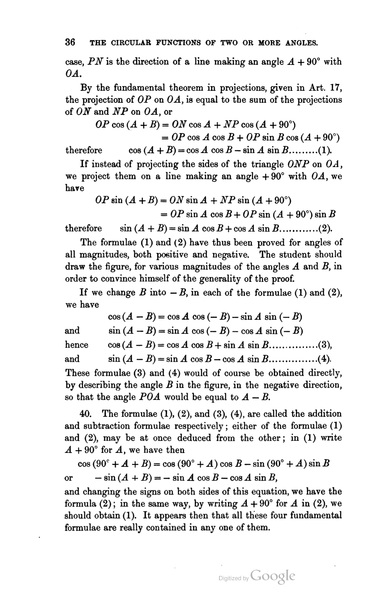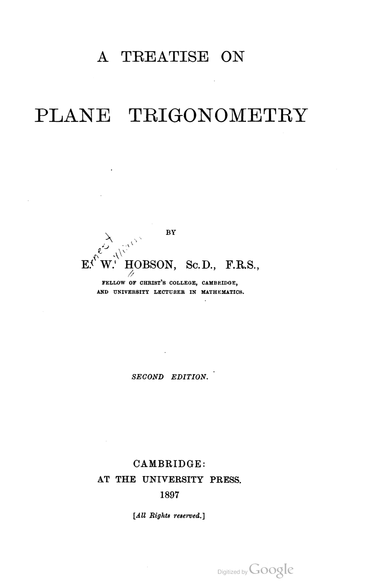 There are multiple copies of Ernest William Hobson's well-known book A Treatise on Plane Trigonometry on the web from the first edition in 1891 to some later editions. Here the 1897 second edition is used exclusively (left image below).