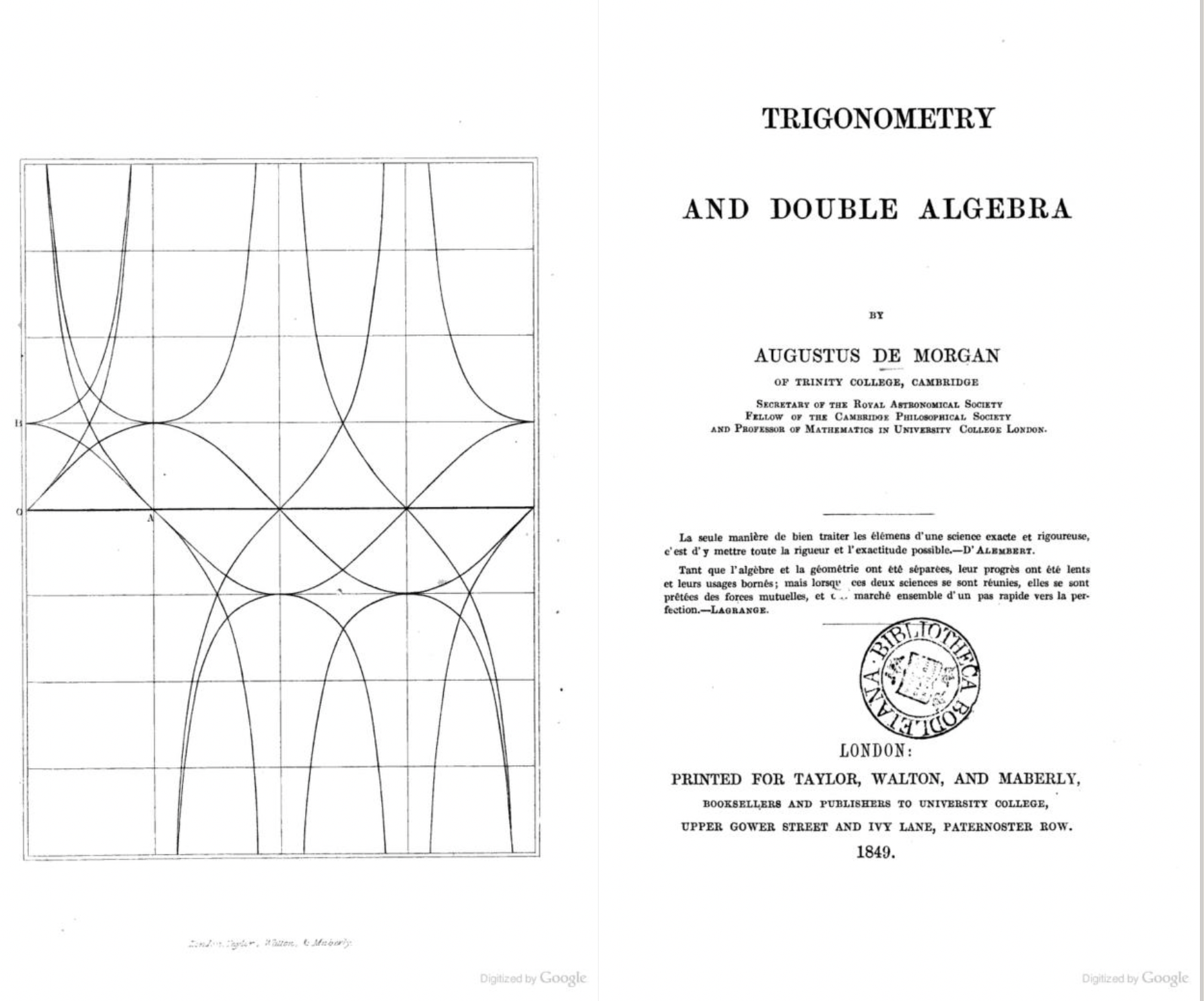 The first trigonomety textbook is Augustus de Morgan's 1849 Trigonometry and Double Algebra (image below).