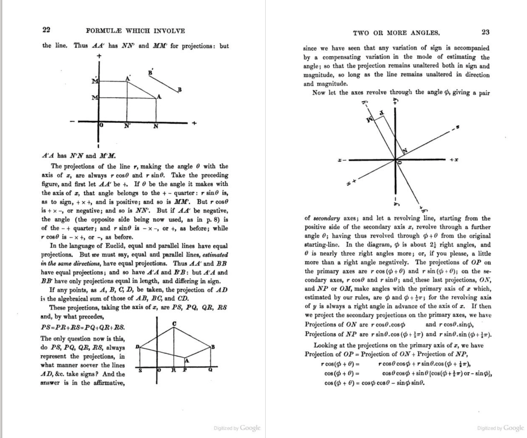 On pp. 22-23, de Morgan proved the angle sum identity for \( \cos() \) near the end of page 23 using projection. This is exactly the same as the Coordinate Axes Rotation concept to be discussed later. Check the diagram on page 23 and you will understand the reason.