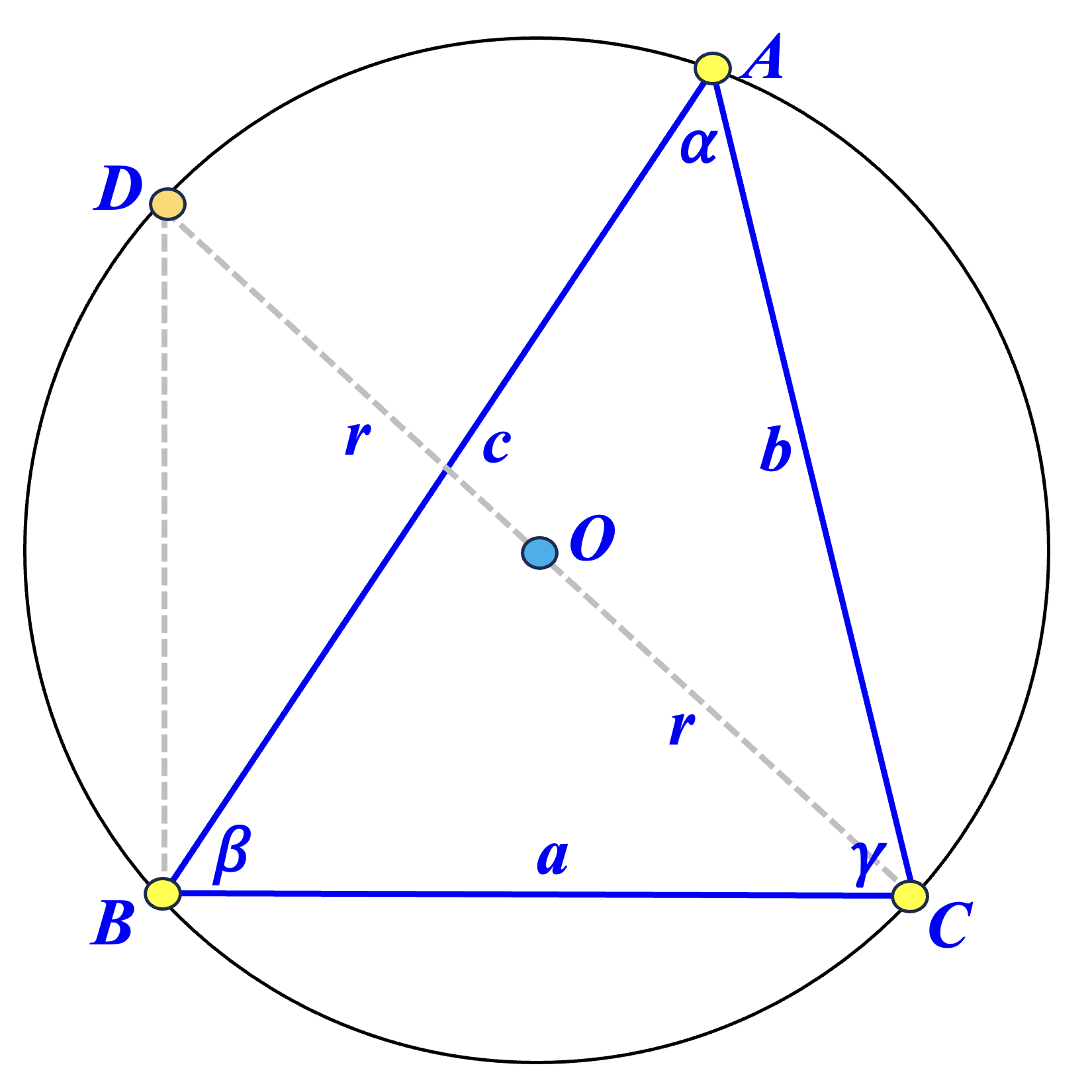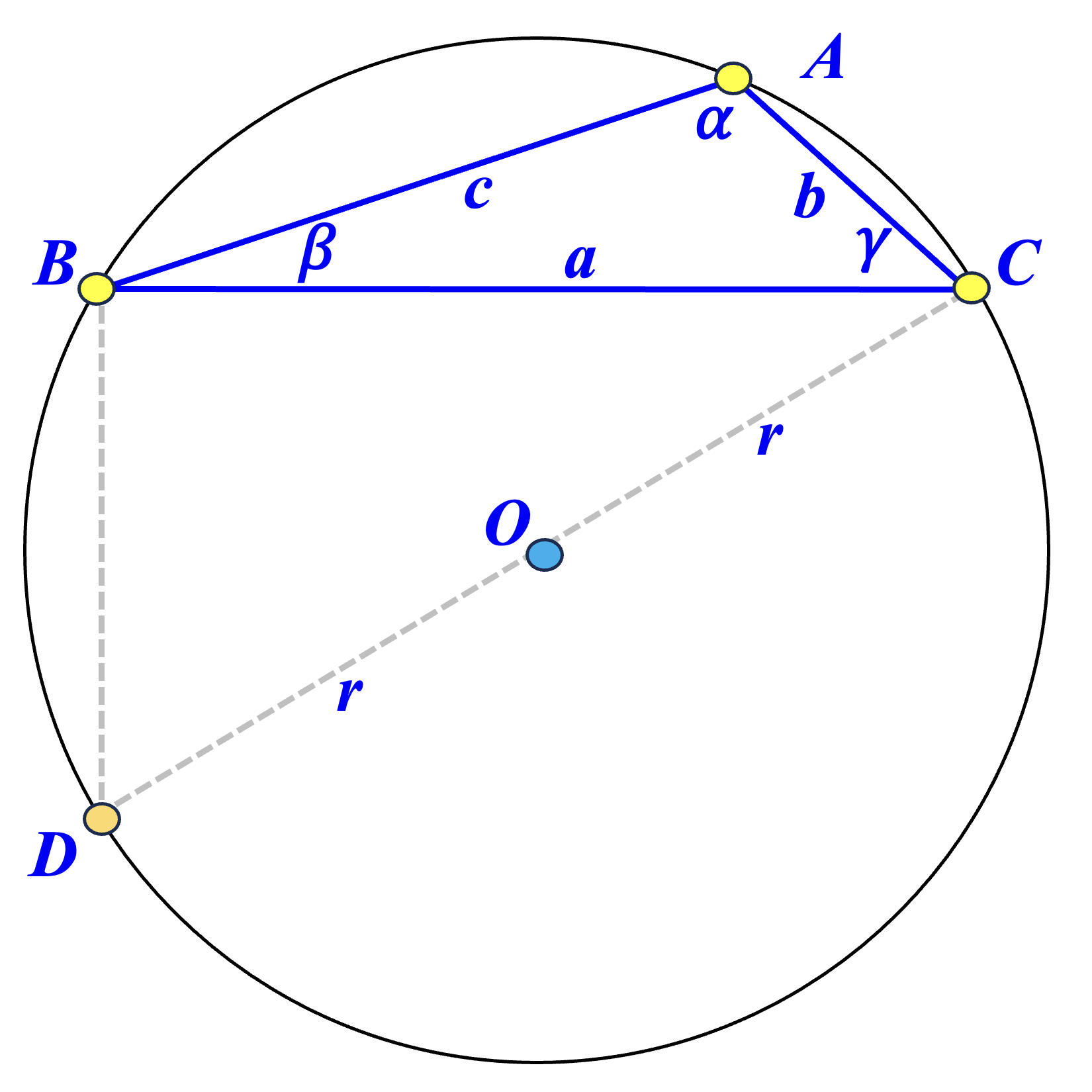 If \( \angle A \) is obtuse (right diagram above), \( A \) and \( D \) are on different sides of \( \overleftrightarrow{BC} \), and \( \sin(\alpha)=\sin(180^{\circ} - \angle CDB) = \sin(\angle CDB) = \frac{a}{2r} \). The following still holds: \[ \frac{a}{\sin(\alpha)} = \frac{a}{\sin(\angle CDB)} = \frac{a}{\left( \frac{a}{2r} \right)} = 2r. \] Therefore, we proved the Law of Sines without using the Pythagorean Theorem and the Pythagorean Identity: \[ \frac{a}{\sin(\alpha)} = \frac{b}{\sin(\beta)}= \frac{c}{\sin(\gamma)} = 2r. \]