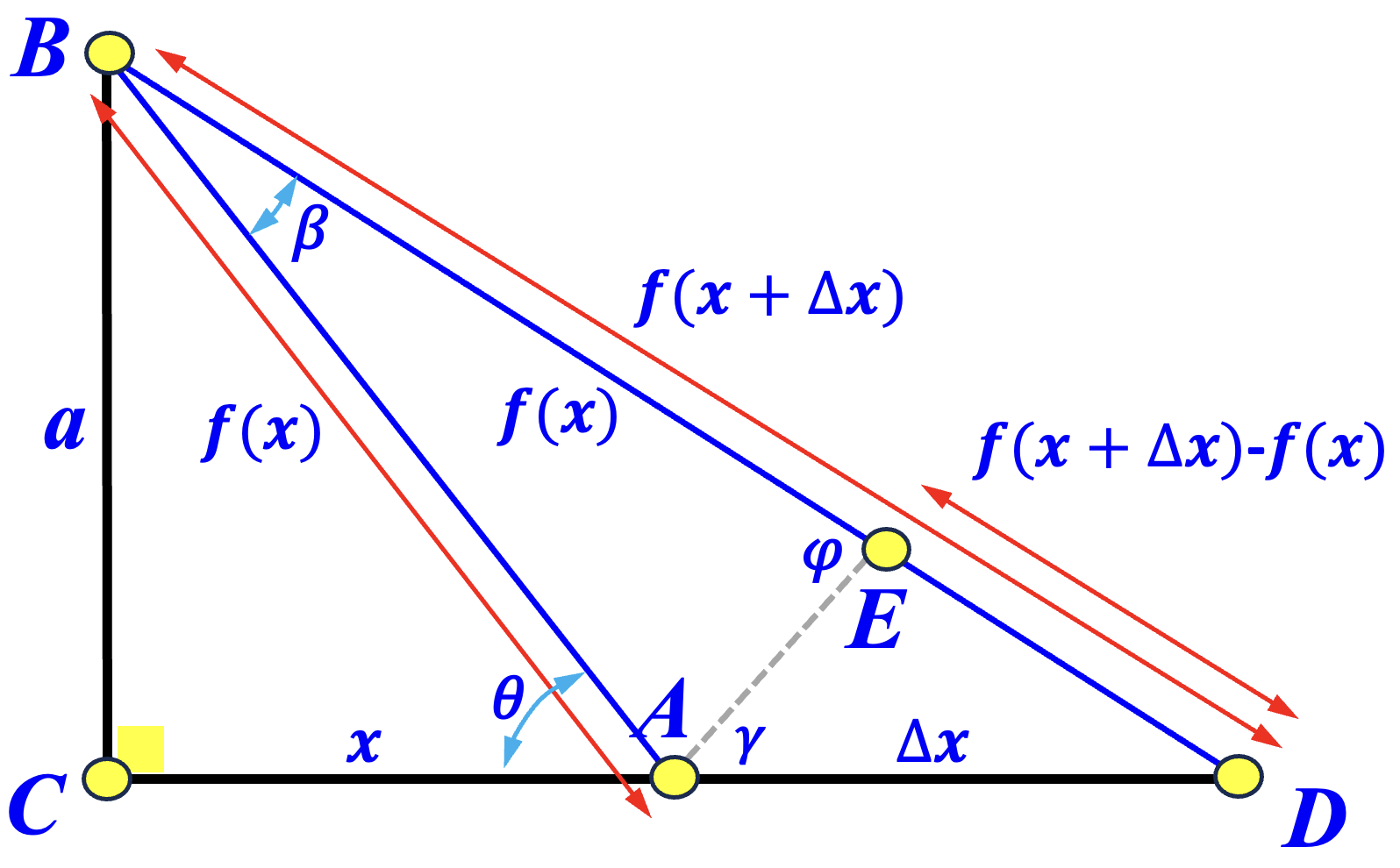 Consider \( \bigtriangleup AED \). The Law of Sines gives \[ \frac{\overline{ED}}{\sin{\gamma}} = \frac{\overline{AD}}{\sin(\angle AED)} = \frac{f(x+\Delta x)-f(x)}{\sin(\gamma)} = \frac{\Delta x}{\sin\left(90^\circ+\frac{\beta}{2}\right)} \] As a result, we have the following: $$ \begin{eqnarray*} f^{\prime}(x) &=& \lim_{\Delta x\rightarrow 0} \frac{f(x+\Delta x)-f(x)}{\Delta x} \\ &=& \lim_{\beta \rightarrow 0} \frac{\sin(\gamma)}{\sin\left( 90^{\circ}+\frac{\beta}{2}\right)} = \lim_{\beta\rightarrow 0} \frac{\sin\left(90^{\circ} - \left( \theta - \frac{\beta}{2} \right)\right)}{\sin\left(90^\circ+\frac{\beta}{2}\right)} \\ &=& \lim_{\beta\rightarrow 0} \frac{\cos\left( \theta - \frac{\beta}{2} \right)} {\sin\left(90^\circ+\frac{\beta}{2}\right)} = \cos(\theta) = \frac{x}{f(x)} \end{eqnarray*} $$ Therefore, we have \( f(x)\cdot f^{\prime}(x) = 1\) or \( (y)dy = (x)dx \). Integrating both sides yields \( f^2(x) = y^2 = x^2 + C\), where \( C \) is a constant. Because \( f(0) = a\), we have \( f^2(x) = x^2 + a^2\) and hence the Pythagorean Theorem holds.